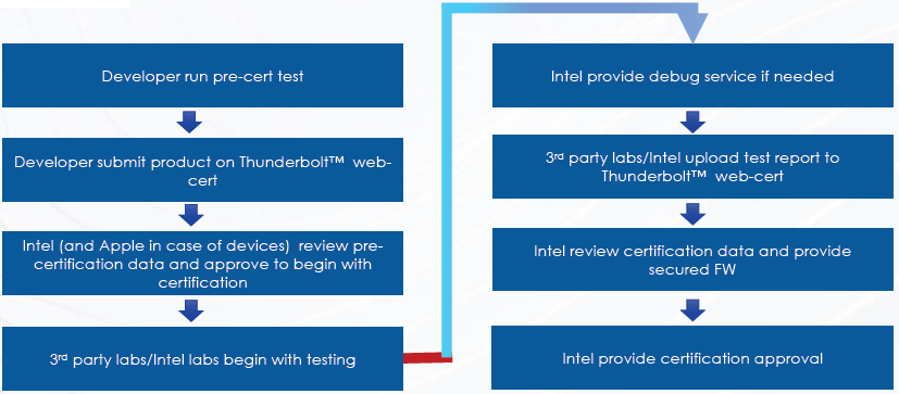 ThunderboltTM是一种高速传输接口,技术由Intel研发,采用USB Type-C®连接器,结合PCI Express,DisplayPort,以及USB Power Delivery,整合资料、影音、电源传输的功能,其传输速度高达40Gbps且用途多元。 运用Thunderbolt介面的产品广泛,如台式电脑、显示器、外接显卡、移动硬盘、网络硬盘等都可以看到它的应用。 一、ThunderboltTM认证流程如下: 1.注册ThunderboltTM账号&与Intel签署NDA,账号申请网址:https://thunderbolttechnology.net/developer-application 2.立项前需提交项目资料给Intel审核; 3.制作产品、提交认证需求给Intel,并联系ATC准备认证样机与认证资料; 4.执行认证测试并取得PASS报告,ATC上传测试结果给Intel审核; 5.将样机邮寄给Intel以色列/苹果美国,进行抽测; 6.获取签名的NVM&升级产品FW,取得认证。 注: *测试完成后,Host需要寄送一台样机到Intel以色列; *Device需要寄送两台样机到Intel以色列,两台样机到Apple美国。 二、TBT认证测试流程 认证测试主要分为三个阶段:Pre-EV,EV Cert,FV Cert。